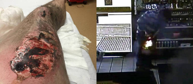 Repentinamente, acontece uma explosão no bolso direito dianteiro do homem. Em seguida, a calça do homem pega fogo, e ele é visto correndo para fora da loja tentando apagar as chamas.