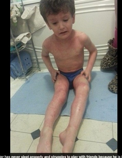 Para suportar a coceira e a dor, ele precisa passar pomada e ficar com faixas na pele inteira. A doença é tão crítica que a criança mal consegue se concentrar para as atividades do cotidiano, explica a mãe, Sarah Scott.
