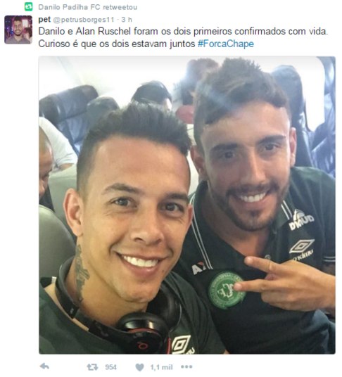 Foto: Reprodução/ Twitter Na imagem, os jogadores Marcos Danilo Padilha e Alan Ruschel.